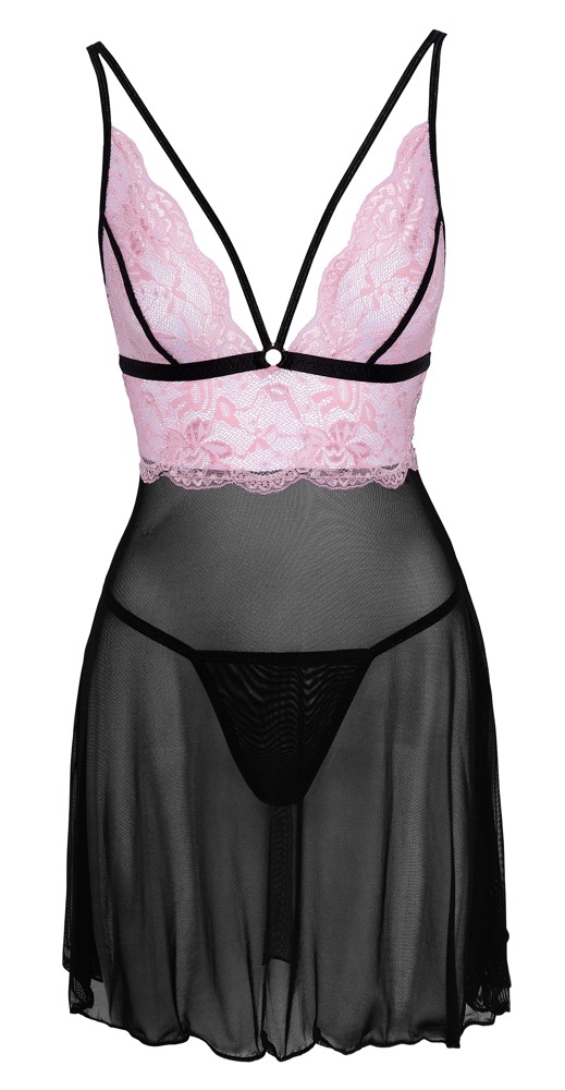 Kurzes, leicht ausgestelltes Babydoll von Cottelli LINGERIE aus elastischem feinem Powernet mit Spitzen-Oberteil. Das Unterbrustband aus glänzendem Gummi verbindet sich vorne und hinten durch Ringe mit den Doppel-Trägern, die verstellbar sind. Ein dazu passender kleiner Transparent-String ist inklusive.