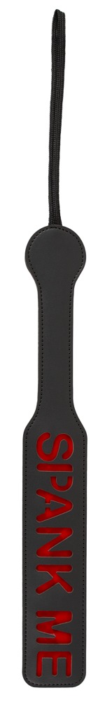 Hochwertiges schwarzes Schlagpaddel von Bad Kitty in stilechter Leder-Optik mit ausgestanztem Schriftzug „Spank me“, der kontrastfarbig in Rot unterlegt ist und sich (spiegelverkehrt) auf dem beklatschten Po abzeichnet. Mit seiner Halte-/Aufhängeschlaufe liegt das Paddel gut in der Hand und sorgt beim Schlagen für anheizende laut klatschende Klapse.