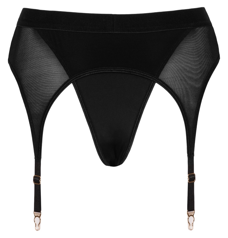 Schwarzer Strap-on-Riostring von Bad Kitty aus weicher Mikrofaser kombiniert mit Strapsgurt aus softem Powernet. String vorne doppellagig gearbeitet und mit Einschub, sowie sorgfältig eingearbeitetem Stretch-Haltering (Ø 3,5 cm) zum Einsetzen eines Dildo/Vibrators mit Stand-/Saugfuß. Die Strumpfhalter sind passend verstellbar.