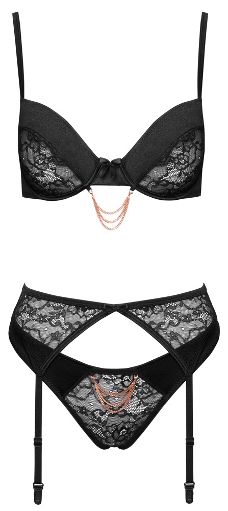 Bügel-BH, Strapsgürtel und Riostring vereint im schwarzen Set von Cottelli LINGERIE. Alles aus feiner weicher Stretch-Spitze und elastischem Satin gearbeitet. BH und String vorne mit roségoldfarbenem Kettchenbesatz, der auch jeweils abgenommen werden kann. Die BH-Träger und der Hakenverschluss im Rücken sind passend verstellbar. Genauso wie der Hakenverschluss hinten im Taillen-Strapsgurt und die Strumpfhalter.