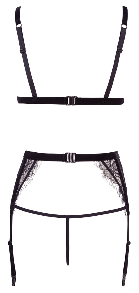 3-teiliges Straps-Set aus edler schwarzer Eyelash-Spitze mit elastischen Samtbändern: Soft-BH, Strapsgurt und String. BH-Träger und Strumpfhalter in der Länge für perfekte Passform verstellbar.