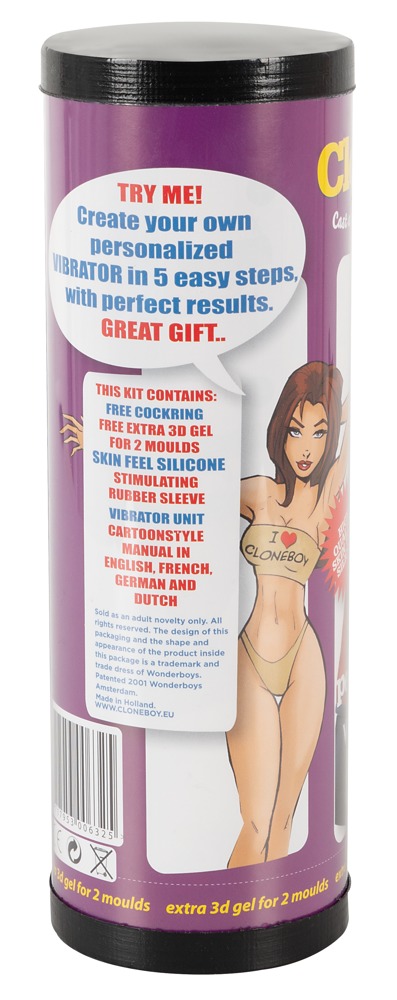 Mit diesem Penis-Abdruck-Set My personalized Vibrator von Cloneboy wird der Penis in seiner schönsten Form verewigt – mit Vibration! So einen individuellen Vibrator gibt es dann nur einmal auf der Welt. Set bestehend aus (die Umverpackung des Sets dient als) Gussform, Penis-Zurrgurt, Manschette, Fläschchen mit Härter, 3-D-Gel für das Erstellen des Abdrucks, Silikongummi, 1 Paar Plastikhandschuhe, Holzspatel, Vibrator, ausführliche Gebrauchsanweisung (D, NL, FR, GB). Ausreichend für Penisgröße (erigiert) bis 20 cm Länge und Ø bis 4 cm. Batterie bitte extra bestellen: 1 x AA.