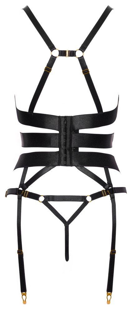 Schwarze Strapscorsage und String ouvert im Set von Cottelli LINGERIE. Stilvoll detailverliebtes Design aus elastischen Bändern und Stretchriemen in edler Satinoptik mit goldfarbenen Accessoires. Rundum weich und anschmiegsam für besten Tragekomfort. Corsage mit eingearbeiteten Formstäben und verstellbarem Hakenverschluss im Rücken. Die hinten mit einem Häkchen verbundenen Träger, die vielen Cup-Riemchen und die Strumpfhalter sind verstellbar für absolut perfekte Passform. Der Riemen-String ist (nicht nur) im Schritt aufregend offen.