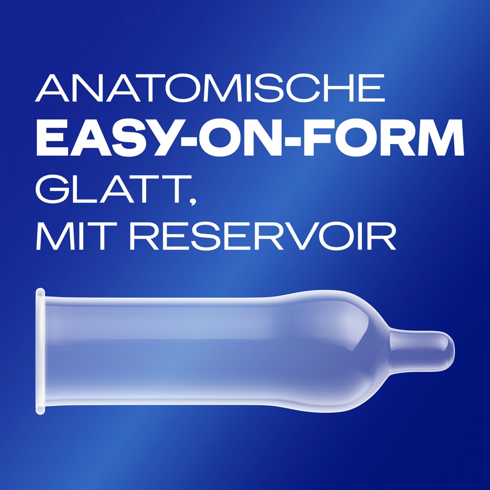 Transparentes, anatomisch geformtes Kondom mit Easy-on Passform für perfekten Sitz und leichteres Abrollen. Das spezielle Herstellungsverfahren verleiht außerdem einen angenehmen Duft. Extrafeucht mit Reservoir. Dermatologisch getestet.