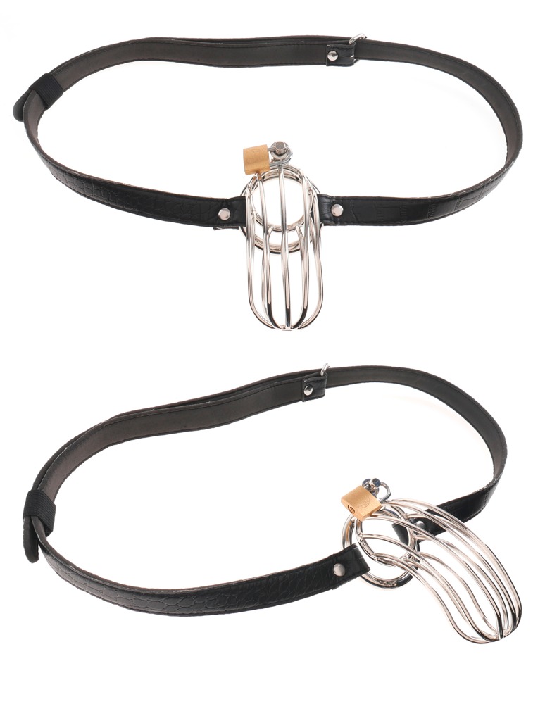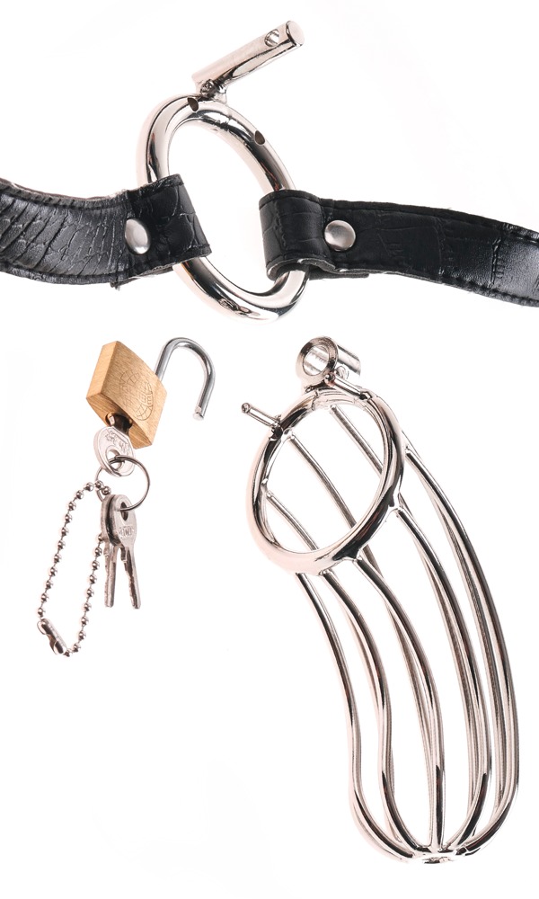 Dieser Keuschheitskäfig für den Penis sieht nicht nur toll aus, er sorgt auch für unnachahmliche Tragegefühle der erzwungenen Enthaltsamkeit! Perfekt auf die männliche Anatomie abgestimmt, lässt sich der Peniskäfig leicht an- und ablegen: Leder-Hüftgurt umlegen, der nicht erigierte Penis kommt in den Käfig und wird am O-Ring des Hüftgurtes arretiert. Selbstverständlich ist der Käfig mit beiliegendem Schloss und Schlüssel abschließbar. Der Träger kann aber noch problemlos urinieren und duschen bzw. baden. Der Peniskäfig ist aus hochwertigem Edelstahl gefertigt und von Hand poliert. Der Leder-Hüftgurt in Schlangenoptik ist größenverstellbar.