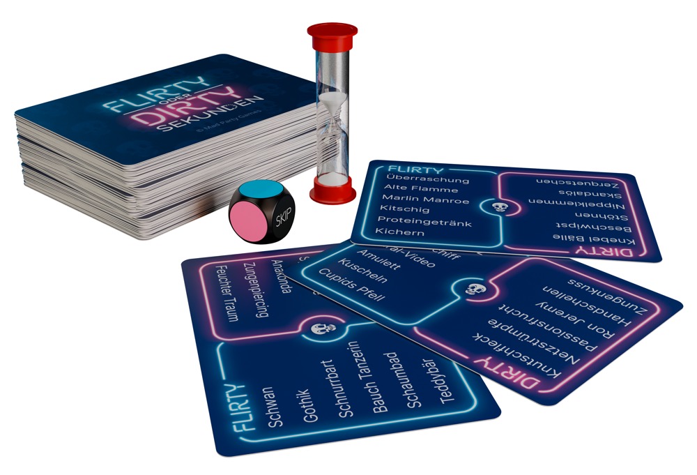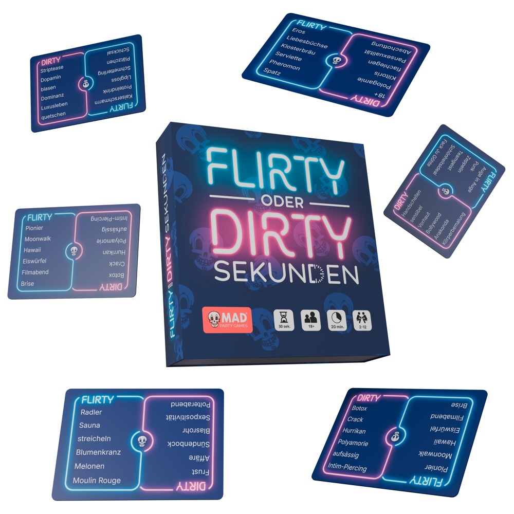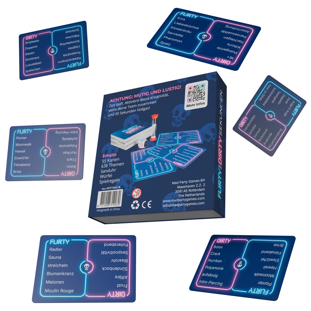 Flirty or Dirty Seconds von Mad Party Games ist ein rasantes wortreiches Ratespiel für frechen anzüglichen Spaß. Teams versuchen, in 30 Sekunden 6 verspielte oder 6 provokante Begriffe zu umschreiben und zu erraten. Der Würfel entscheidet, welche Begriffe gespielt werden. Werden alle 6 Begriffe erraten, gibt es doppelte Punkte. Perfekt für Partys, zum Vorglühen, als Geschenk oder einfach für unvergessliche Abende mit Freunden.