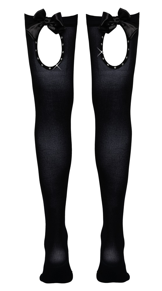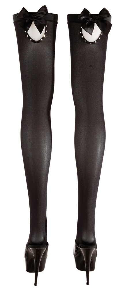 Schwarze Halterlos-Strümpfe mit Schleifen- und Strassverzierung an der Aussparung. Mit silikonverstärktem Abschluss.