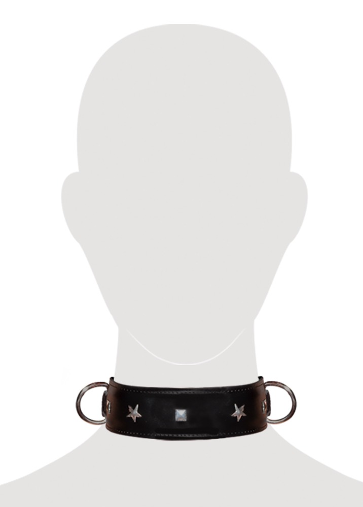 Halsfessel, komplett aus hochwertigem, robustem Glattleder mit genähten Kanten und dekorativen Ringen. Zwei seitliche D-Ringe laden zum Anleinen und Bestrafen ein. Größenverstellbar.