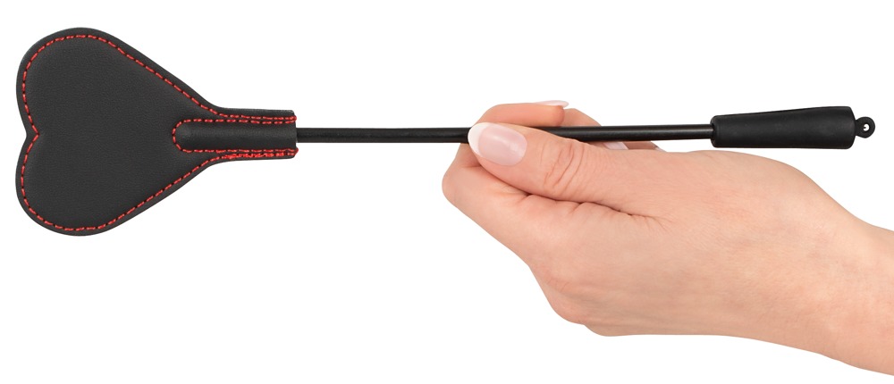 Kleine schwarze Gerte mit Schlagpaddel (Optik kann variieren). Eine Seite in Lederoptik, die andere mit Kunstfell. Nähte in Rot.