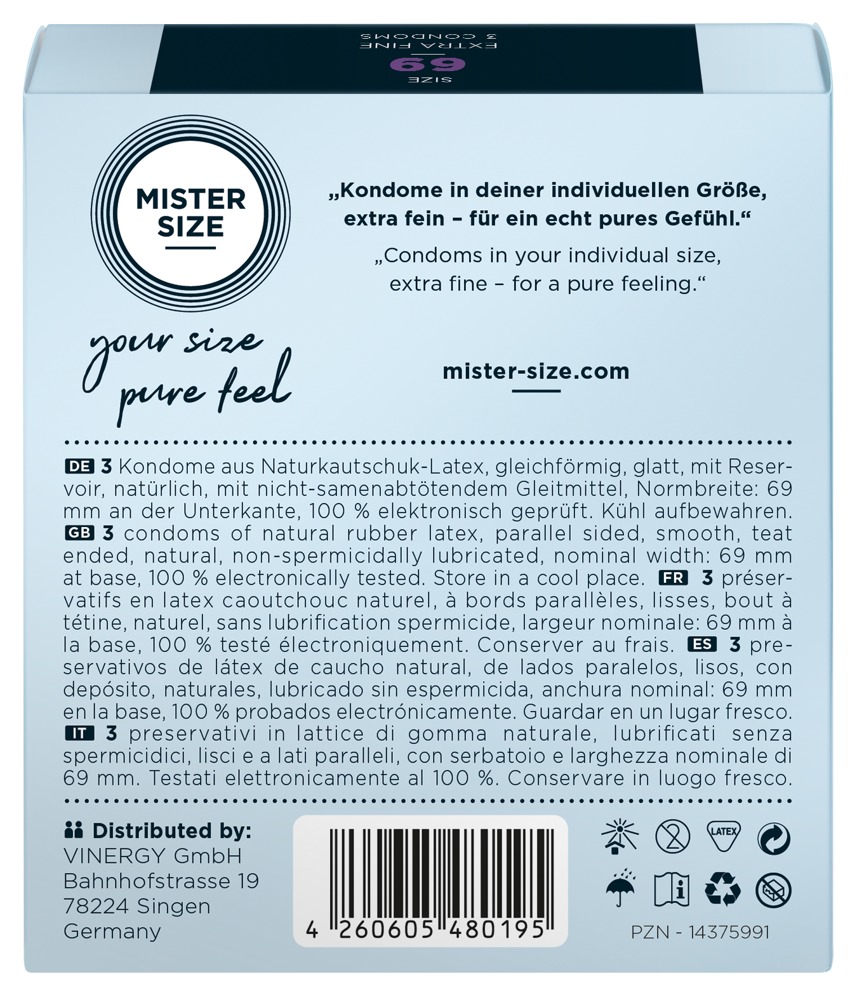 Transparente, hauchdünne Kondome Mister Size (69 mm) aus Naturkautschuklatex mit Gleitcreme-Beschichtung und Reservoir. Vegan.