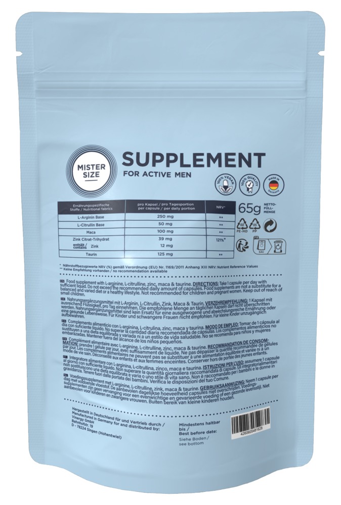 MISTER SIZE Supplement for active men ist ein speziell für den Mann entwickeltes Nahrungsergänzungsmittel mit L-Arginin, L-Citrullin, Zink, Maca & Taurin. 100% vegane Qualität. Hergestellt in Deutschland. Kleine Kapseln für einfache Einnahme.