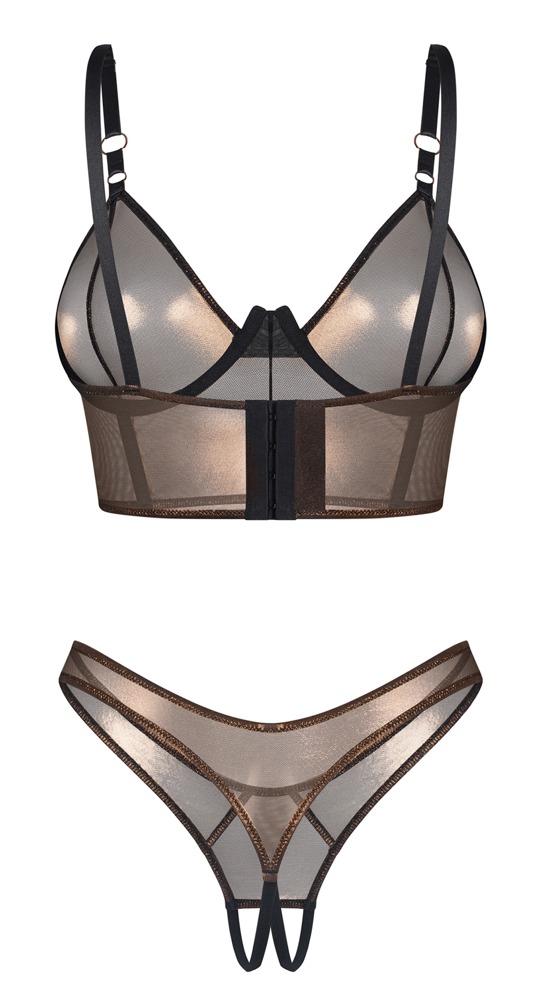 Set Soranna von Obsessive mit Bügel-BH und Riostring ouvert. In bronzefarbener Semitransparenz mit edlem Schimmer. Schwarze Details setzen stylische Akzente. Rundum elastisch und weich anschmiegsam für besten Tragekomfort. Etwas länger geschnittener Bügel-BH mit passend verstellbaren Trägern und verstellbarem Hakenverschluss im Rücken. Der Riostring ist im Schritt verführerisch offen.