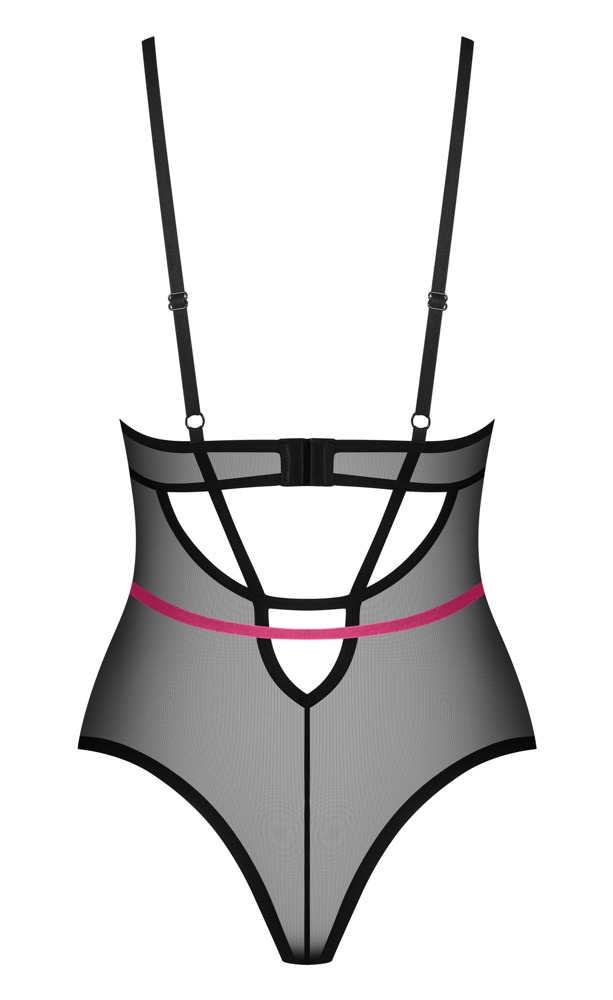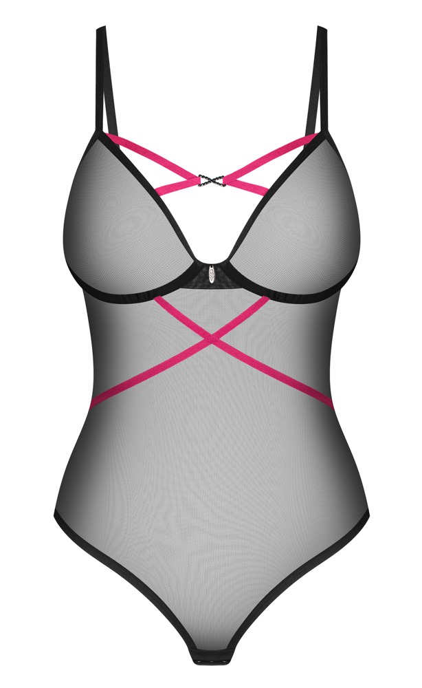 Stringbody Novenes von Obsessive aus feinem schwarzem Powernet mit pinkfarbenen Riemchen-Akzenten vorne und hinten. Weich und elastisch für hohen Tragekomfort. Zwischen den soften Cups mit Dekolleté-Riemchen und schönem Strasselement. Die Träger und der Hakenverschluss im freien Rücken sind passend verstellbar.