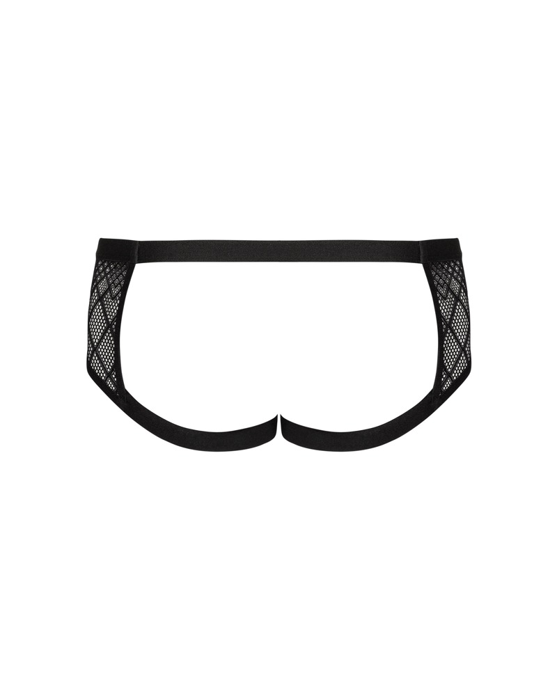 Schwarzer Jock Severio von Obsessive in extravagant gemusterter Transparenz mit blickdicht unterlegtem Beutel. Weich und elastisch für vollen Komfort. Bequemer Gummibund mit kleinem Metall-Element vorne. Bequeme Jock-Straps lassen den Po aufregend frei, pushen und betonen.