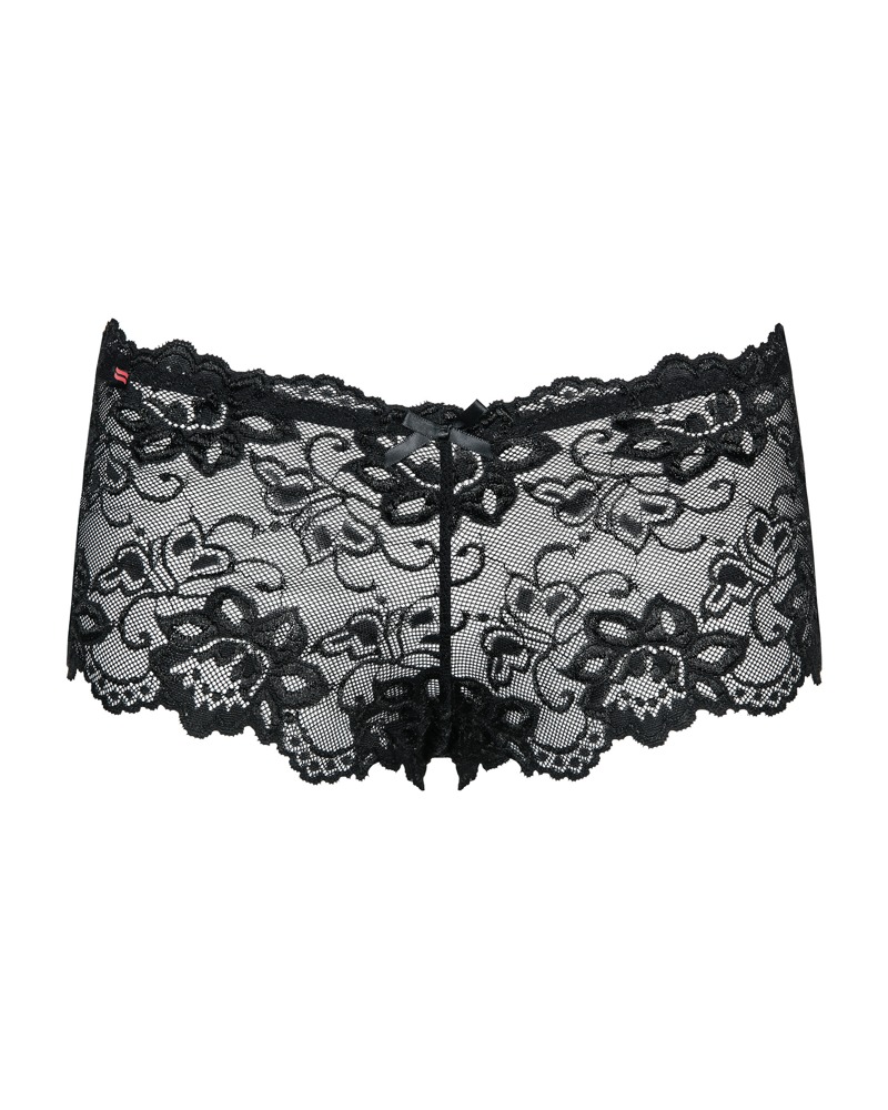 Transparent-schwarze Panties Idillia von Obsessive komplett aus zarter Blütenspitze. Rundum weich und elastisch für hohen Tragekomfort. Vorne am Bund mit Satinschleifchen verziert.