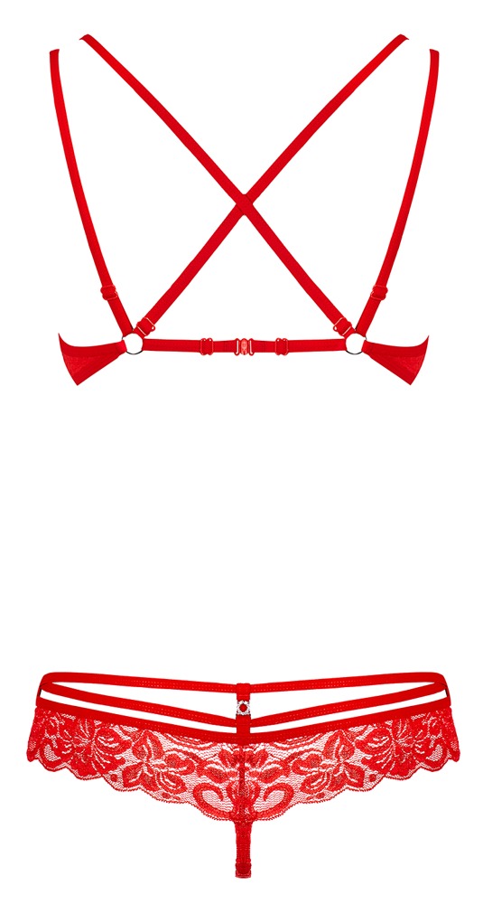 Das schöne Ensemble besteht komplett aus Spitze und brilliert mit den kleinen Strassstein-Elementen an BH und String. Die dekorativen Bänder und doppelten Träger sind Blickfänger für Trägerin und Betrachter.