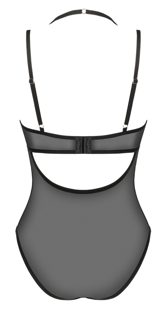 Schwarzer eleganter Body Selinne von Obsessive aus feinem weichen Stretch-Netz. Blickdichte Cups aus softer Mikrofaser mit Cup-Bügeln in Kontrastfarbe Rosa. Im freien Rücken mit passend verstellbarem Hakenverschluss. Auch Neckholder und Träger sind für perfekte Passform verstellbar.