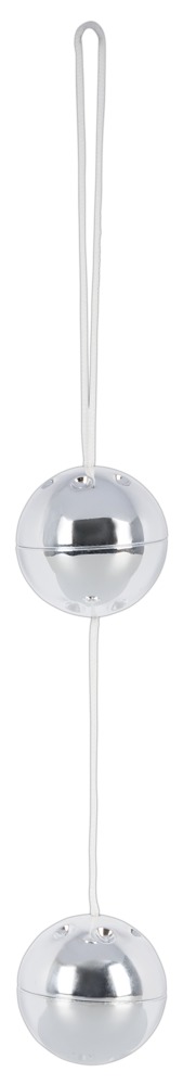 7. Silberfarbene Liebeskugeln an weißem Rückholband: Kugel-Ø 3,4 cm, Rückholbandlänge 9,5 cm.