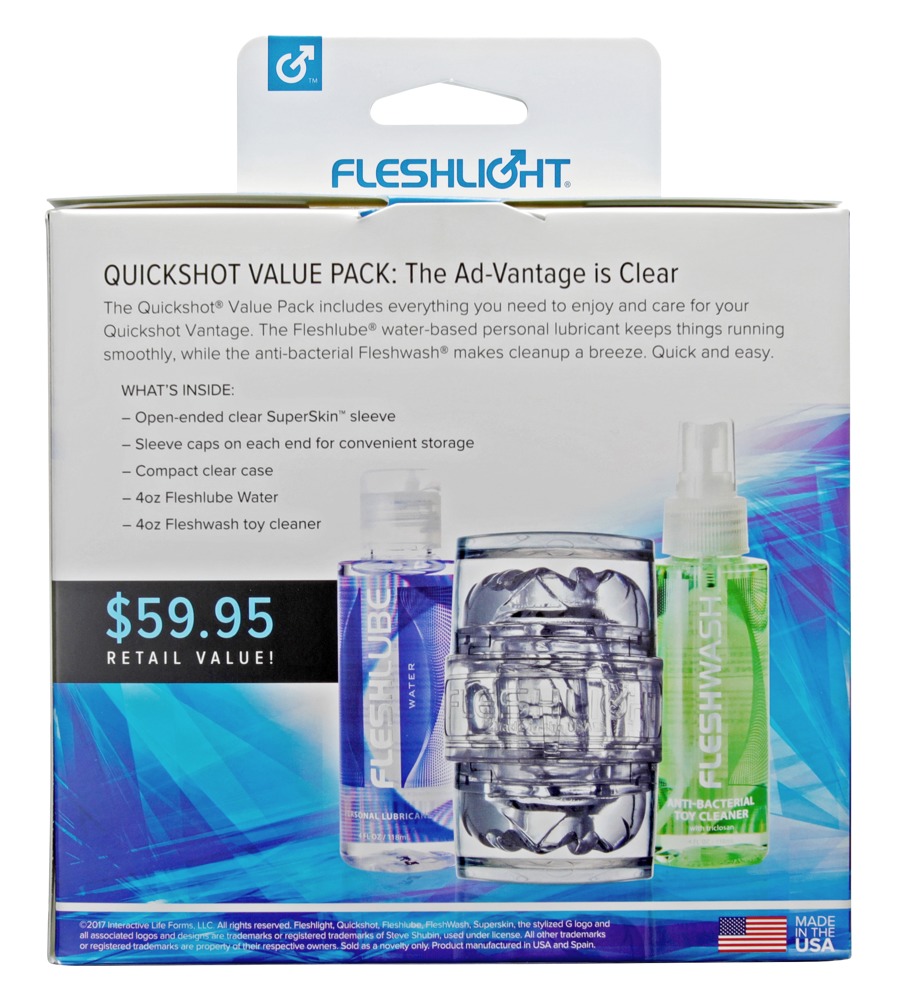 3-teiliges Set Quickshot Vantage Combo Pack von Fleshlight mit Quickshot-Masturbator, Fleshlube-Gleitgel und Fleshwash-Reinigungsspray.