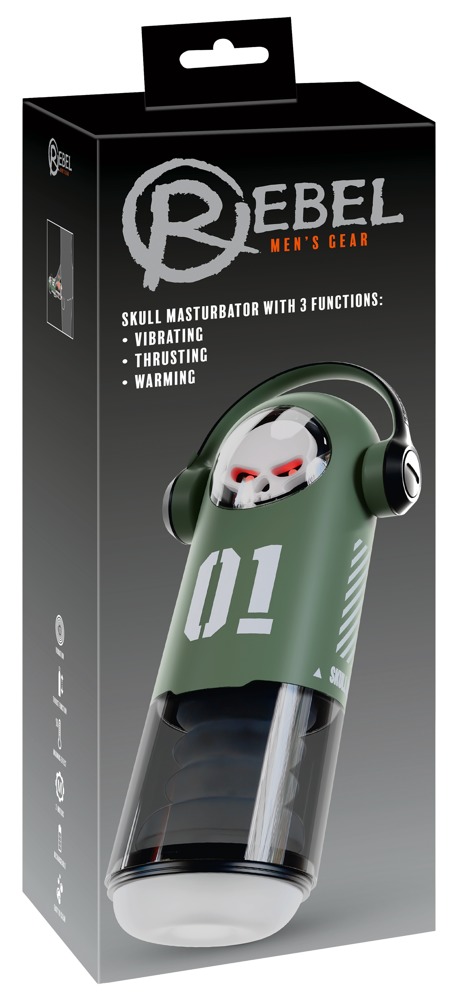 Handlicher SKULL Masturbator with 3 Function von Rebel in stylischer Totenkopf-Optik. Verwöhnt den Penis rundherum mit durchdringenden Vibrationen und kraftvoller Stoßmassage. Die Wärmefunktion bringt den Masturbator schnell auf die richtige Körper- und Betriebstemperatur – und seine Augen zum roten Leuchten. Das perfekte Zusammenspiel aus innovativer Technik und einzigartigem Design. Für unvergessliche Höhepunkte!