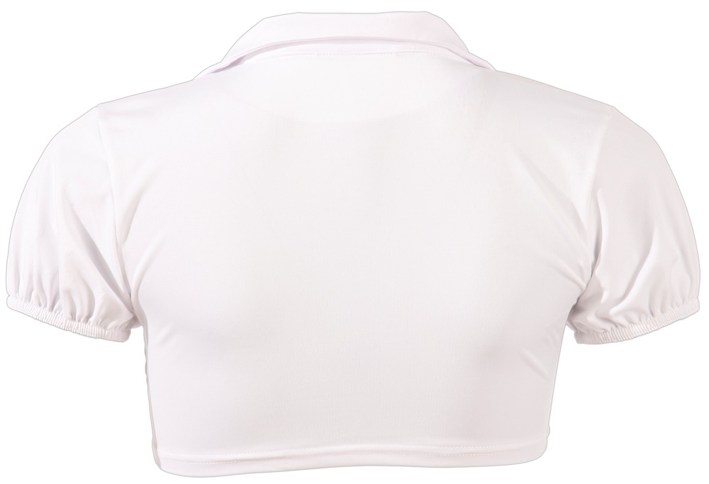 Kurze Bluse zum Knoten, Falten-Minirock mit aufregendem Po-Ausschnitt, woraus der Rüschenslip mit angenähten, verstellbaren Strapsen hervorblitzt. Hinten Reißverschluss. Passend dazu eine strenge Krawatte und Strümpfe.