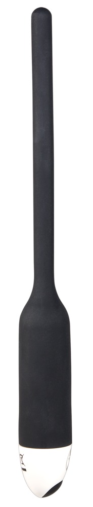 Schwarzer Dilator mit Vibration in sieben Stufen. Sehr biegsam. Gesamtlänge ca. 19 cm, Einführtiefe 11 cm, Ø 8 mm. Material: Silikon mit PU-Überzug. Inklusive Batterien.